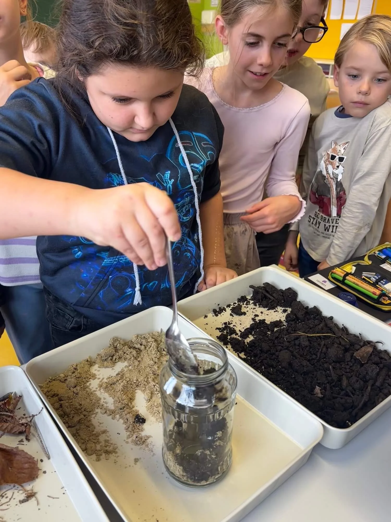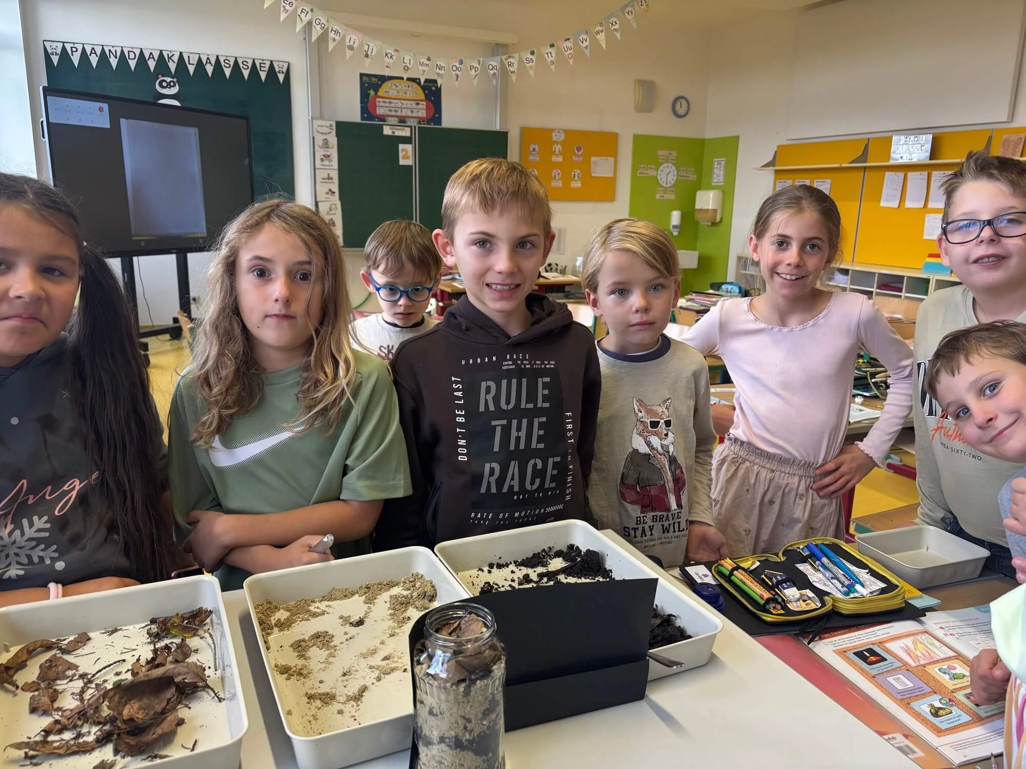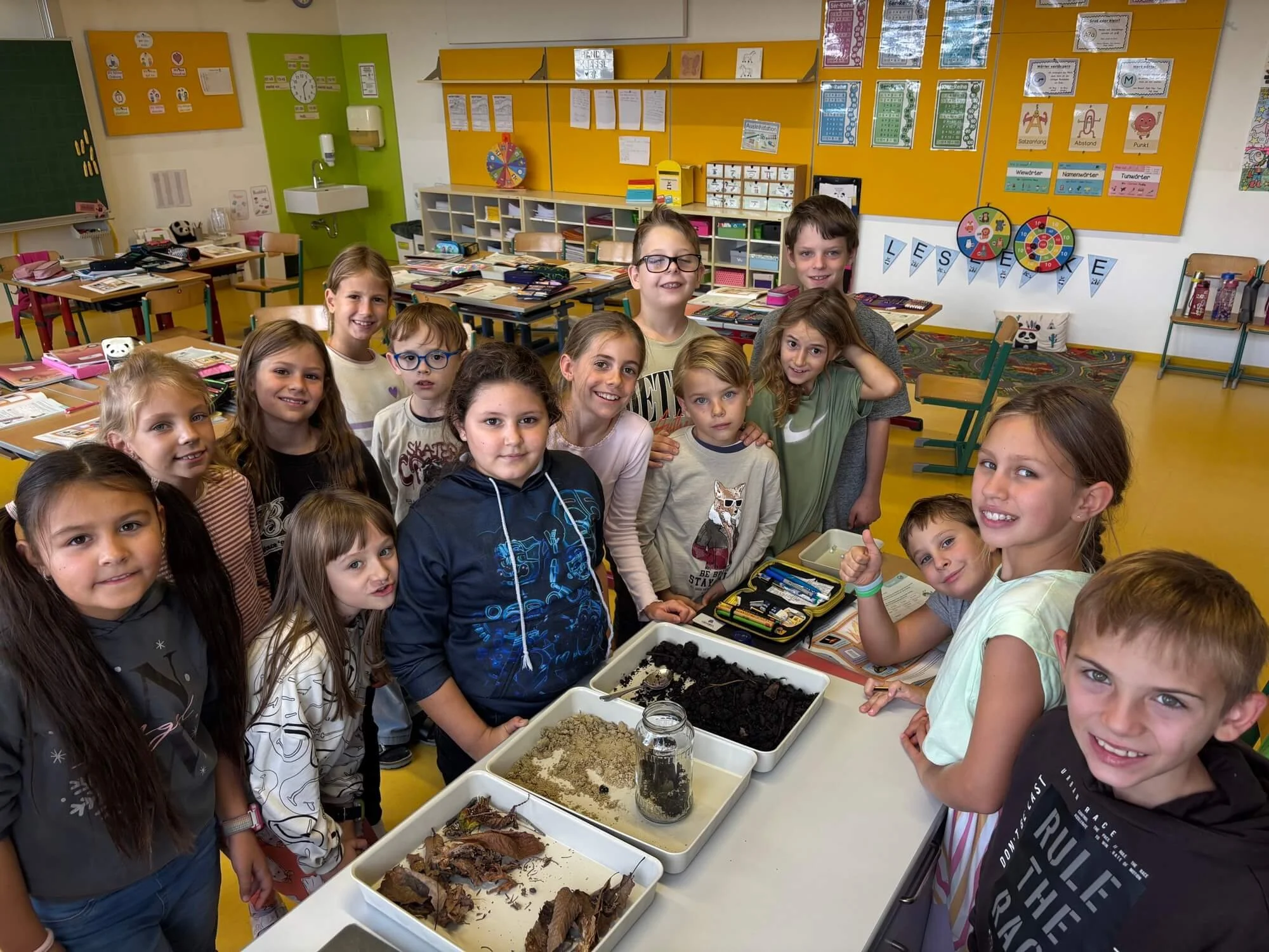 Anfang Oktober bauten die Kinder der 3. Klasse eine Wurmbeobachtungsstation für Regenwürmer. Die eingesammelten Bewohner wurden 14 Tage lang in ihrem neuen Habitat beobachtet und studiert und anschließend wieder ins Freie entlassen!